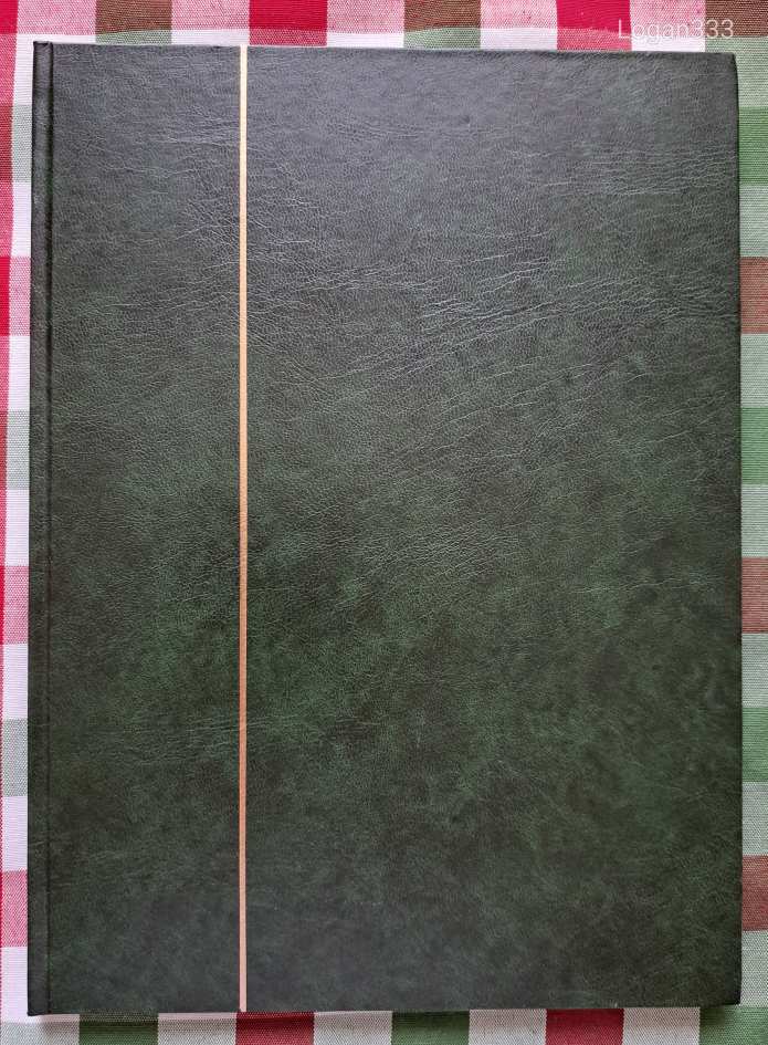 Márványos mohazöld színű, kemény műbőr borítású, arany színű csíkkal díszített, A/4-es méretű, 4 törtfehér lapos (8 oldalas), hófehér elő- és utó oldalas ÚJ Briefmarken gyűjtő – tároló bélyegalbum.
