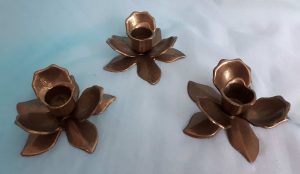 3 db alacsony kivitelű réz gyertyatartó + egy ajándék üveg pezsgő