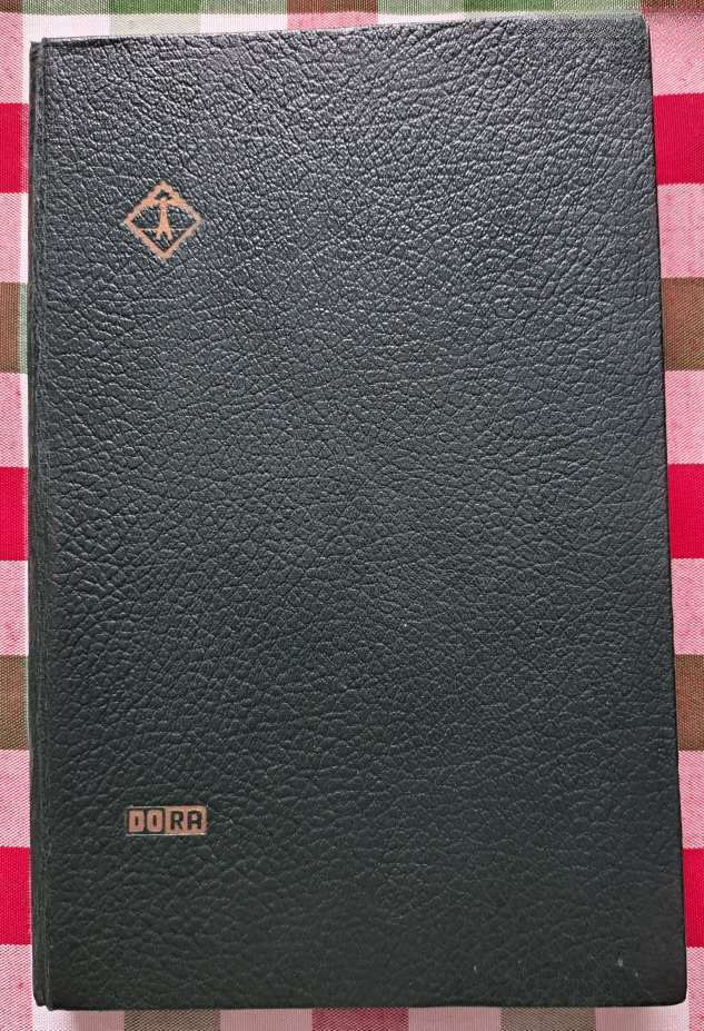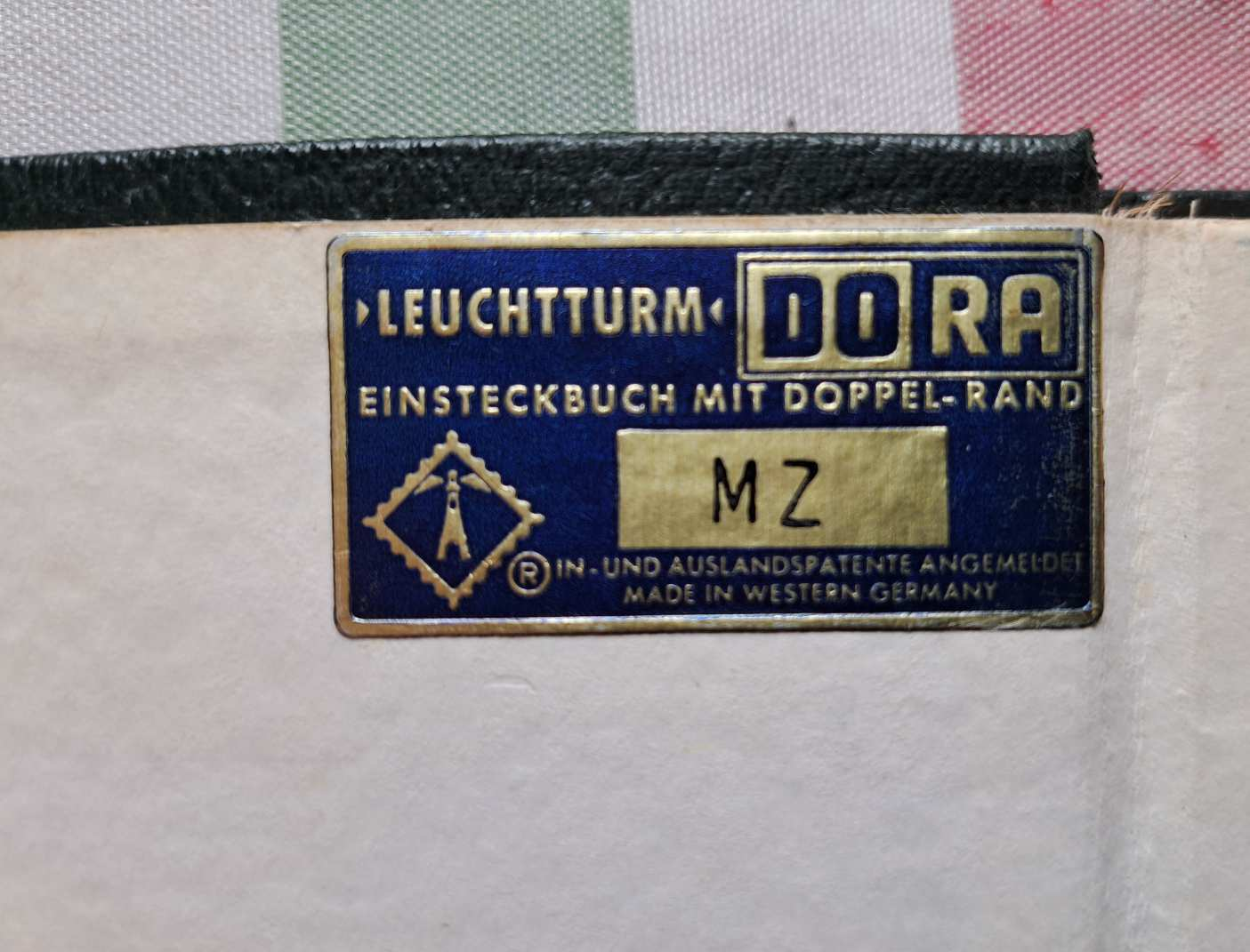 Mély mohazöld színű, kemény műbőr borítású, arany színű logóval és felirattal díszített, A/5-ös méretű, 8 törtfehér színű lapos (16 oldalas), tört fehér elő – és utó oldalas LEUCHTTURM DORA gyűjtő-tároló bélyegalbum.