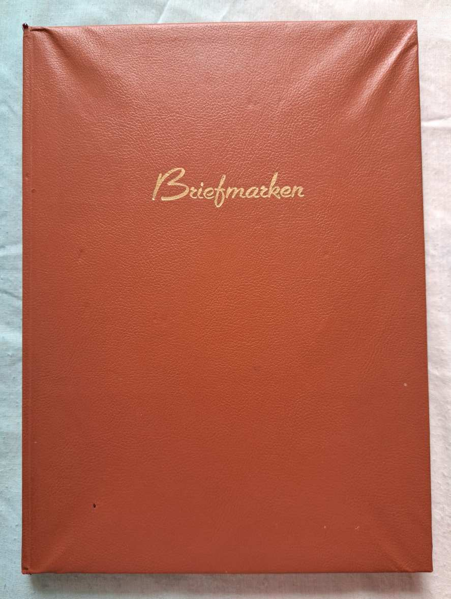 Sötétkék színű, szövet hatású, kemény karton borítású, arany színű feliratos logóval díszített, A/4-es méretű, 8 márványos törtfehér lapos (16 oldalas), tört fehér elő – és utó oldalas Briefmarken rendező bélyegalbum.