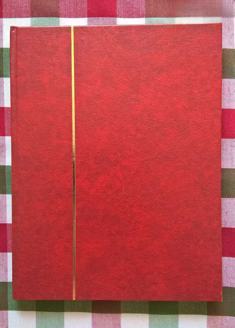 Márványos meggypiros színű, kemény műbőr borítású, arany színű csíkkal díszített, A/5-ös méretű, 6 törtfehér lapos, (12 oldalas), fehér elő- és utó oldalas, ÚJ Briefmarken gyűjtő-tároló bélyegalbum.