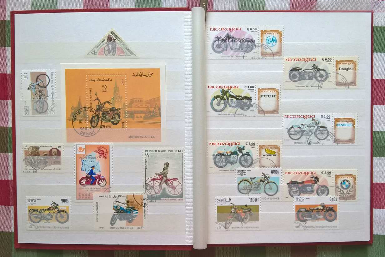 A licit tárgya: 6 törtfehér lapos / 12 oldalas, ÚJ A/5-ös méretű Briefmarken bélyegalbum tele „Kerékpárok – motorok – autók” témájú bélyegekkel
