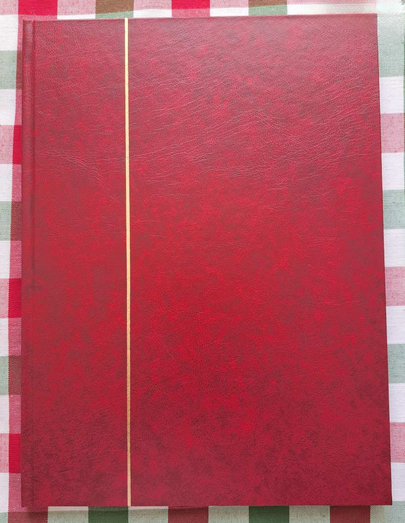 Márványos meggypiros színű, kemény műbőr borítású, arany színű csíkkal díszített, A/4-es méretű 4 törtfehér lapos (8 oldalas), hófehér elő – és utó oldalas, ÚJ Briefmarken gyűjtő – tároló album.