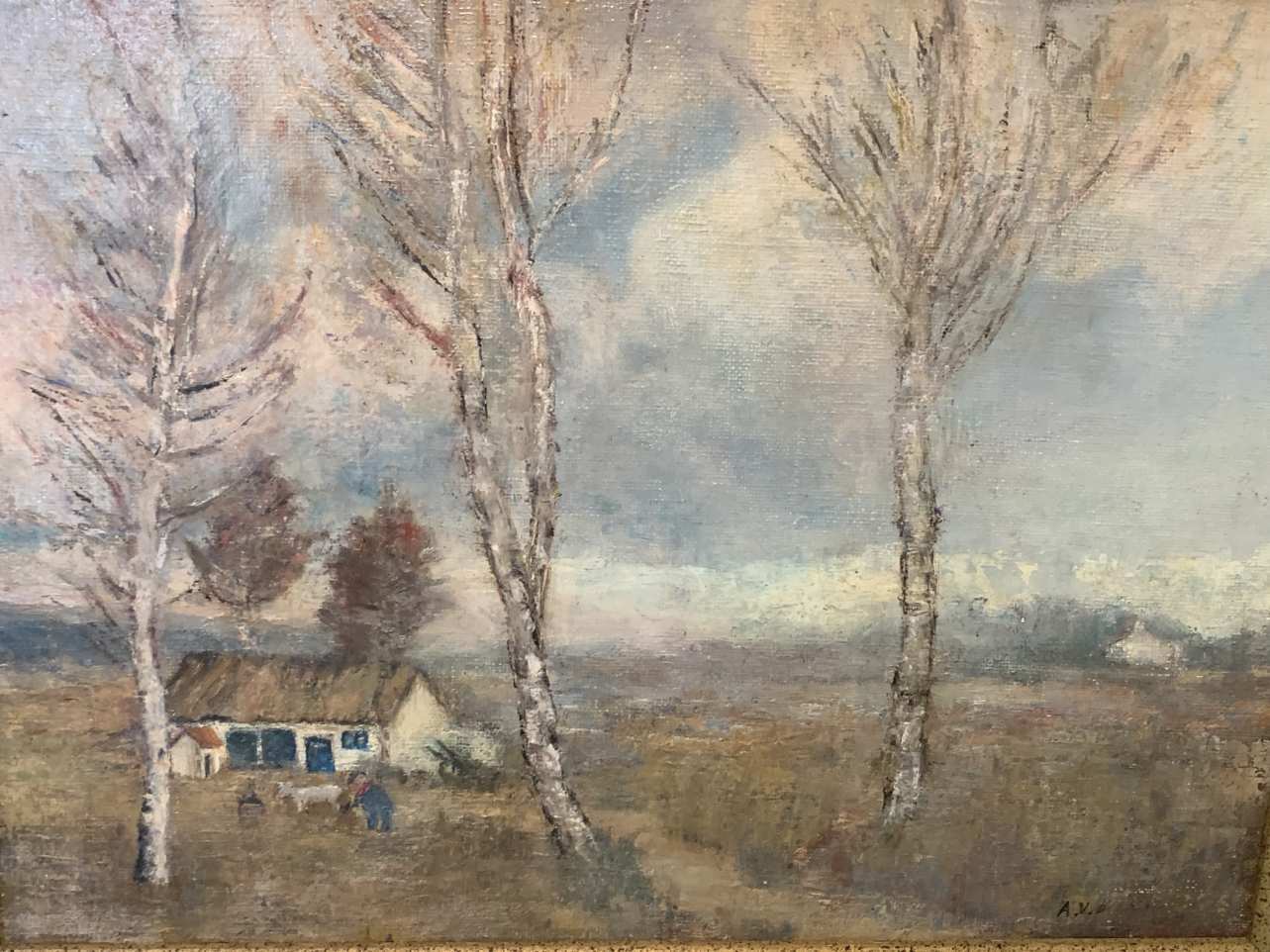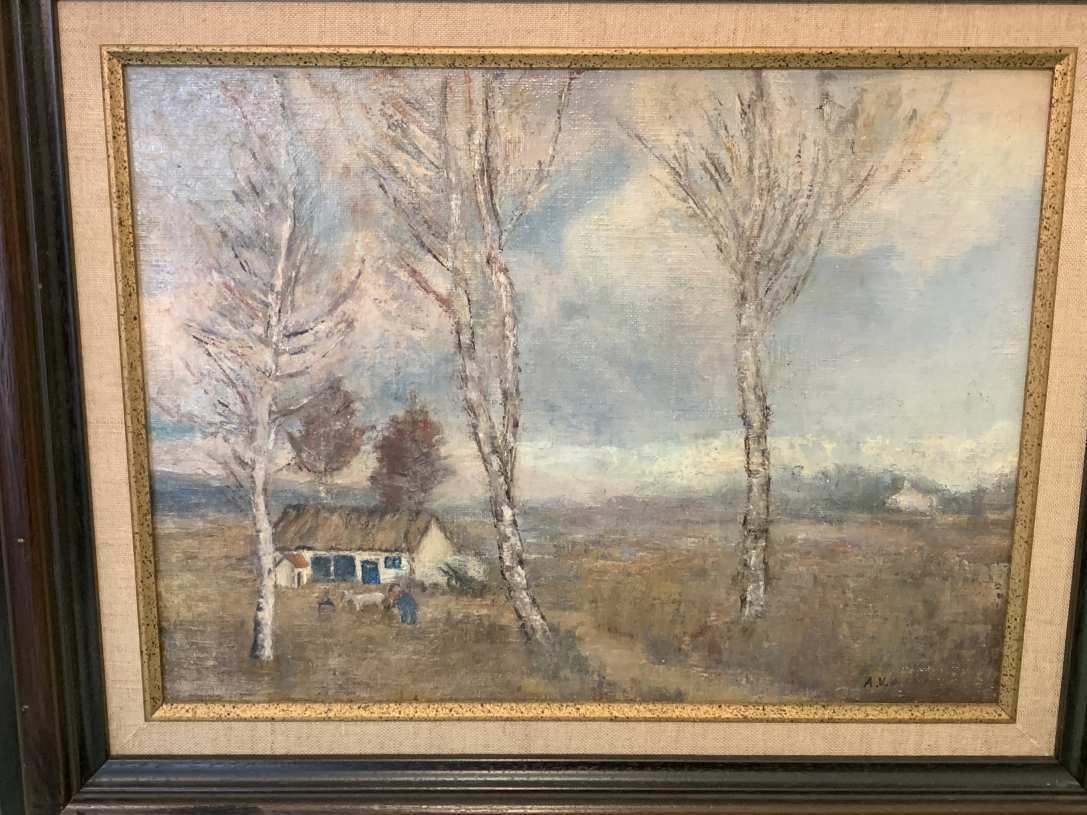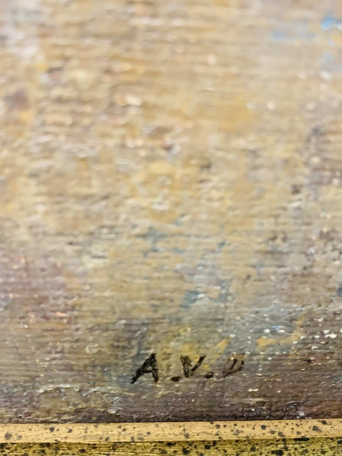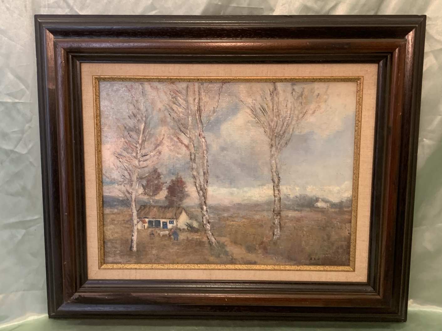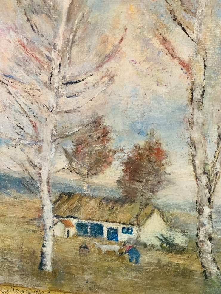 MÉRETES ANTIK OLAJ VÁSZON FESTMÉNY, PASZTEL SZÍNVILÁGÚ TÁJKÉP, MŰVÉSZ ALKOTÁS + egy ajándék üveg pezsgő