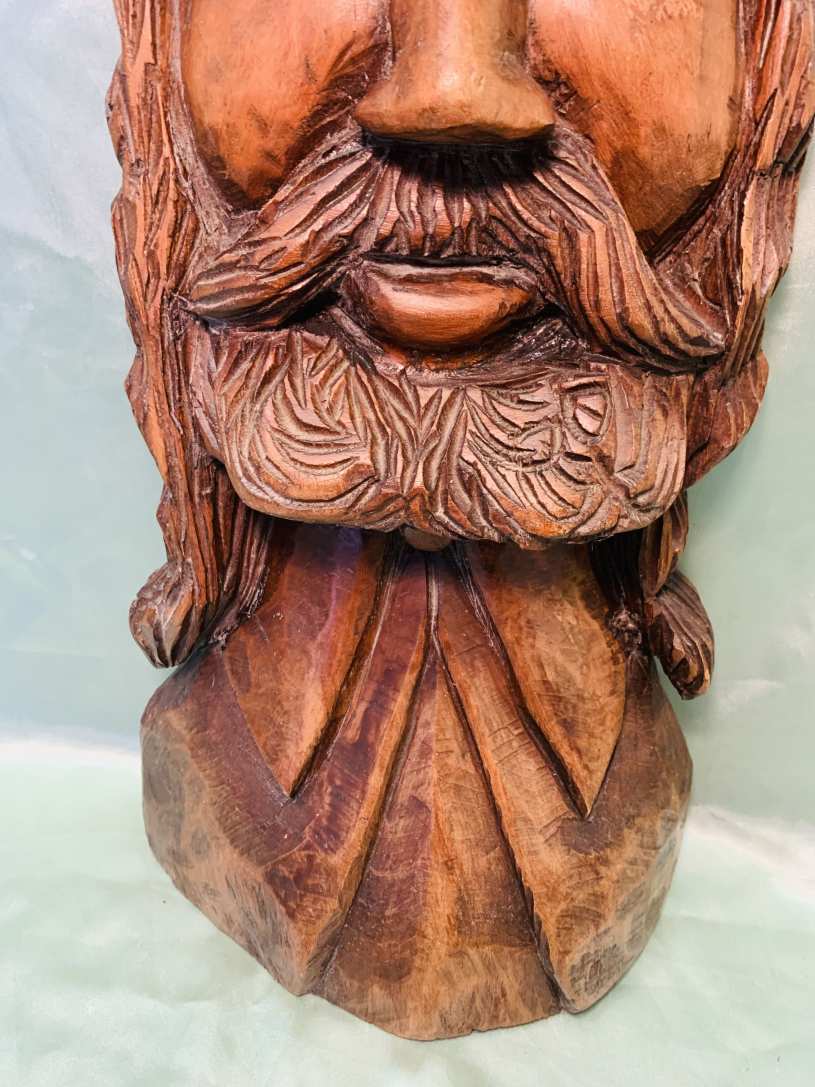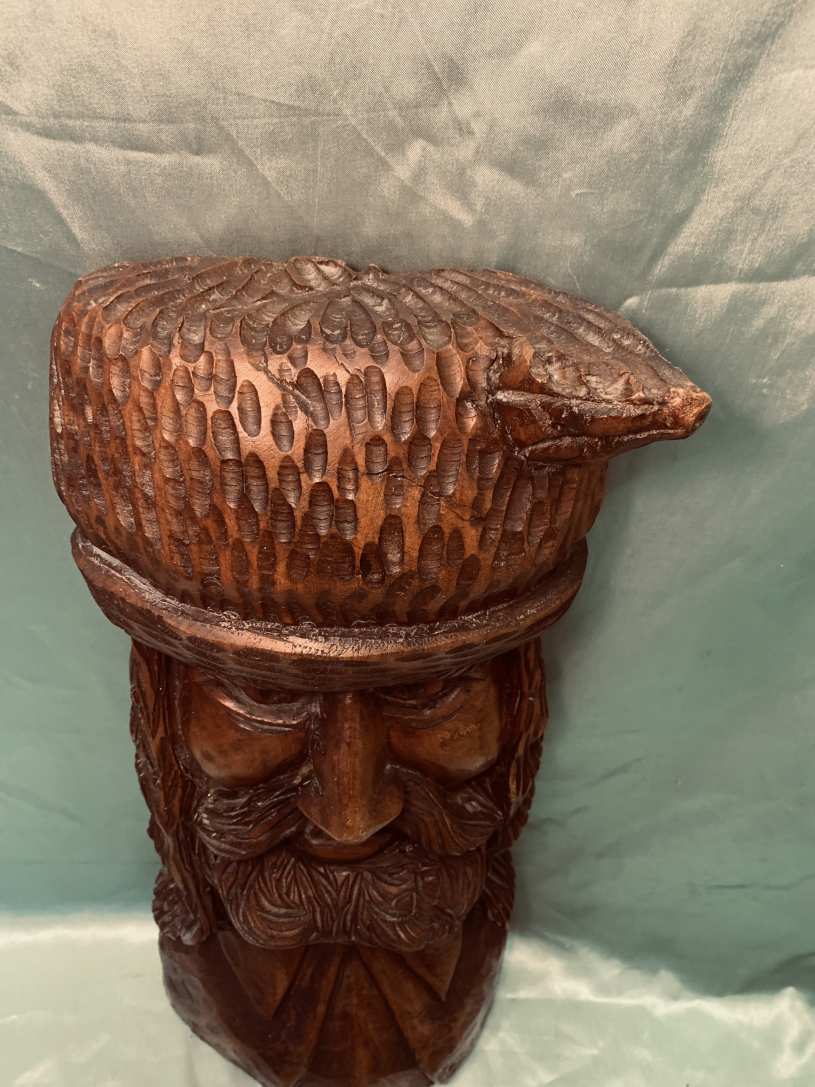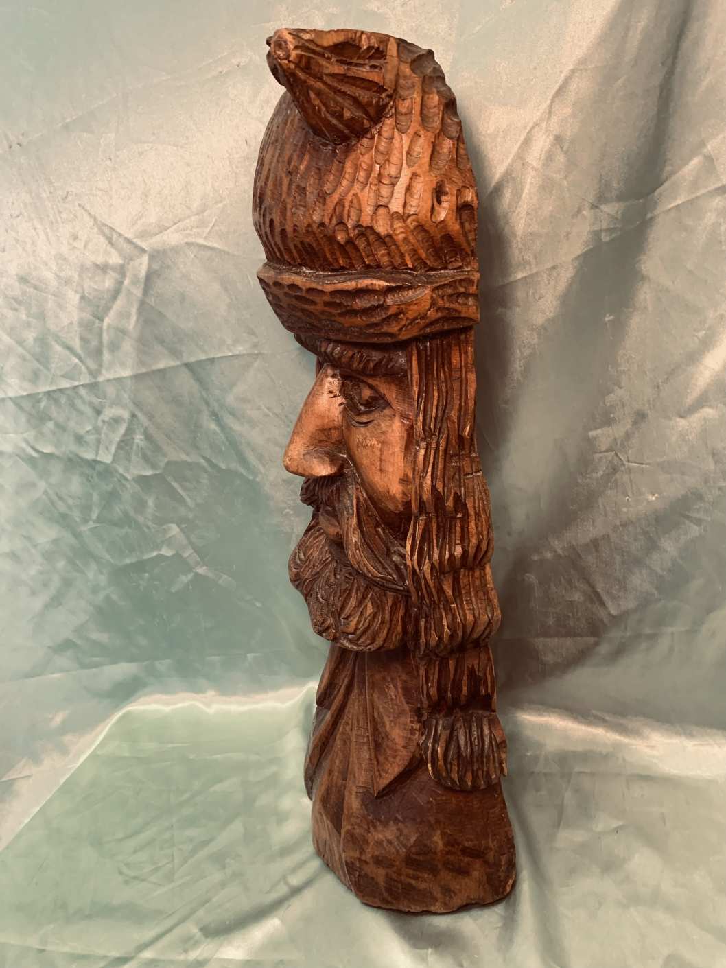 NAGY 54 cm. ANTIK FÁBÓL FARAGOTT SZOBOR. ÉLETHŰEN MEGMUNKÁLT FÉRFI MELLSZOBRA RÉSZLET KAZDAG SZOBRA + egy ajándék üveg pezsgő