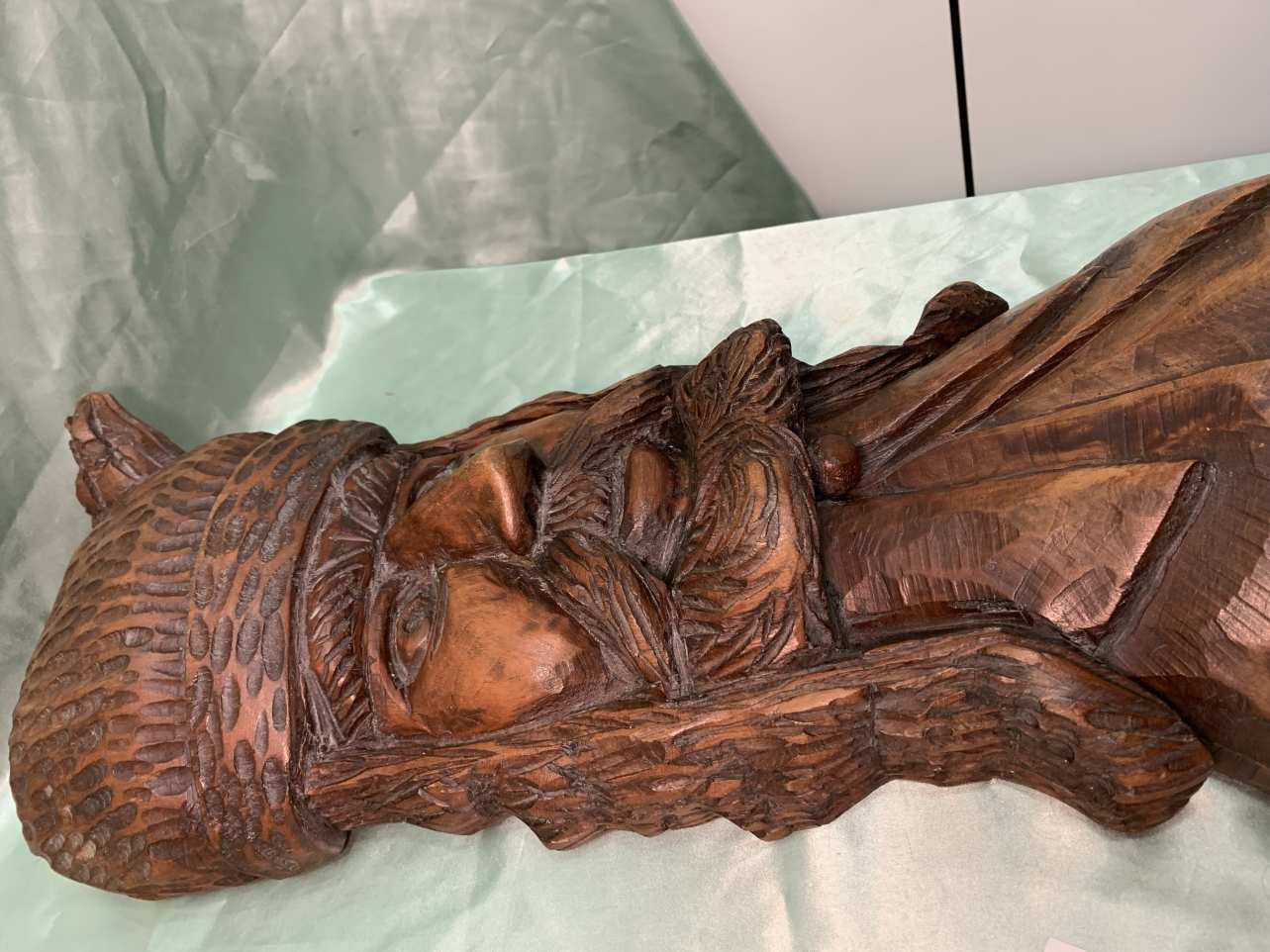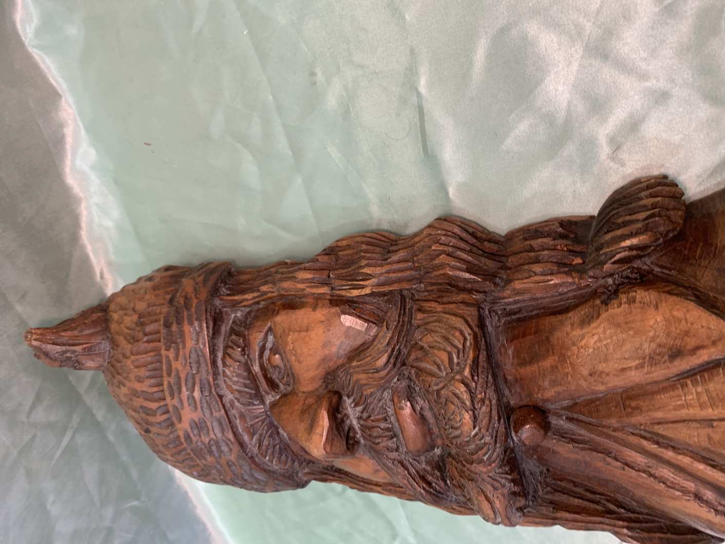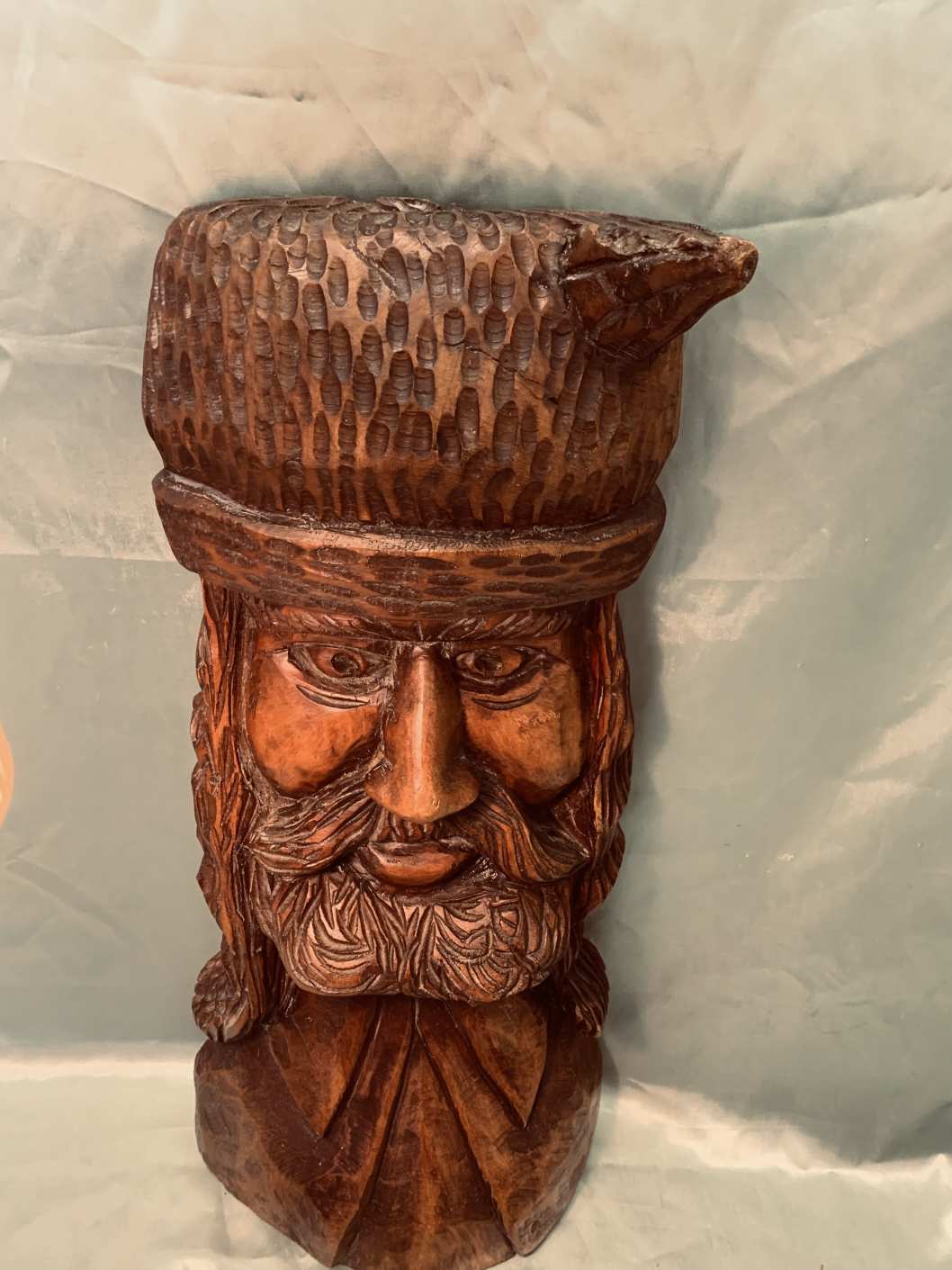NAGY 54 cm. ANTIK FÁBÓL FARAGOTT SZOBOR. ÉLETHŰEN MEGMUNKÁLT FÉRFI MELLSZOBRA RÉSZLET KAZDAG SZOBRA + egy ajándék üveg pezsgő