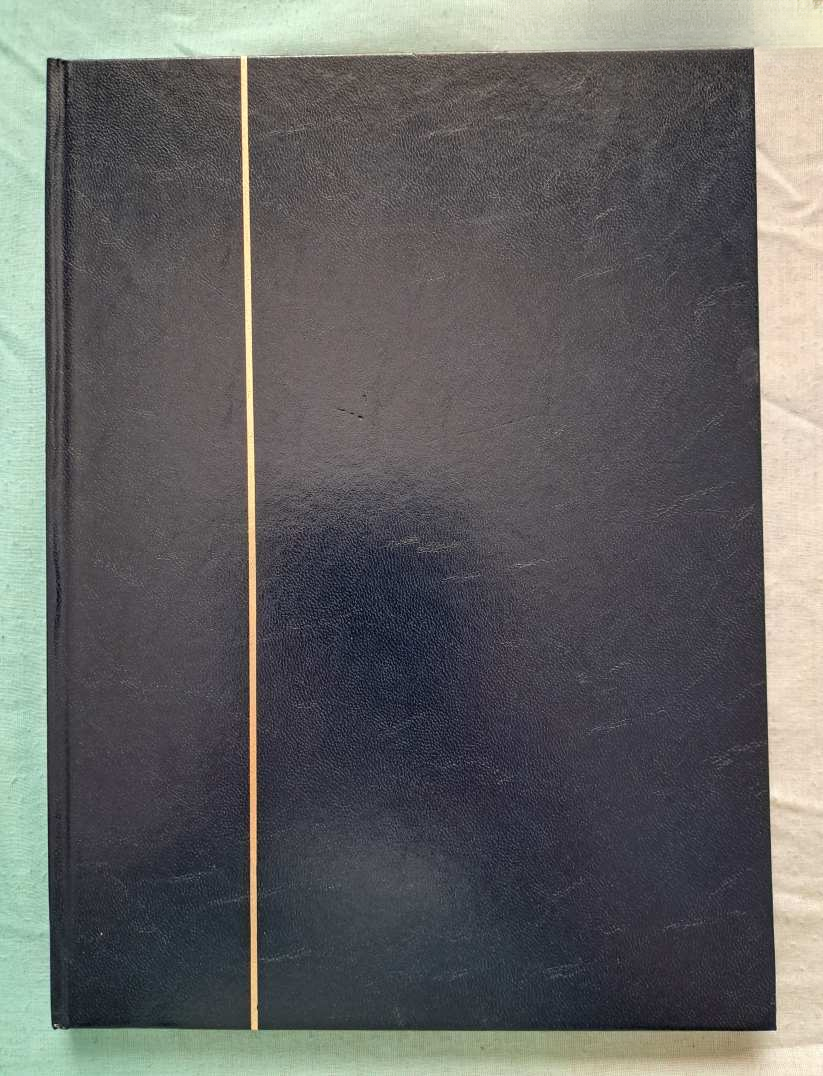Márványos sötétkék színű, kemény műbőr borítású, arany színű csíkkal díszített, A/4-es nagyságú, 4 törtfehér lapos (8 oldalas), hófehér elő- és utó oldalas, BRIEFMARKEN gyűjtő – tároló bélyegalbum.