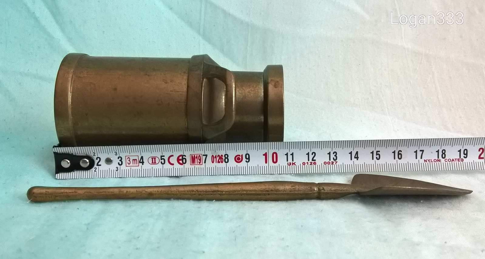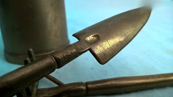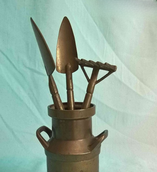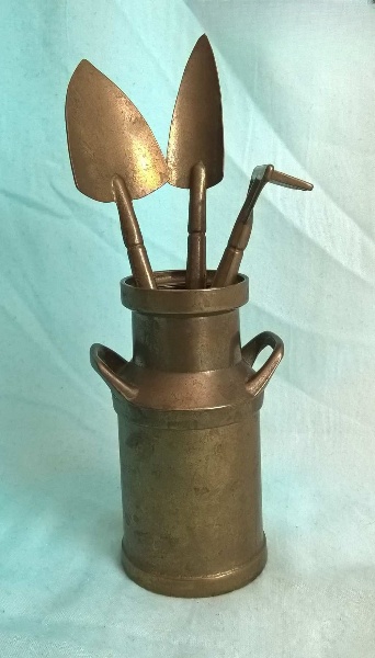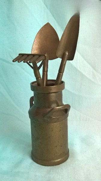 Szép kivitelű, öntött, réz kanna 3 db kerti szerszámmal (lapát, ásó, gereblye – amik szintén réz öntvények), igen dekoratív darabok.