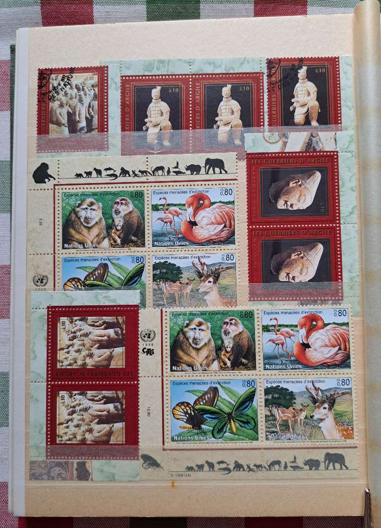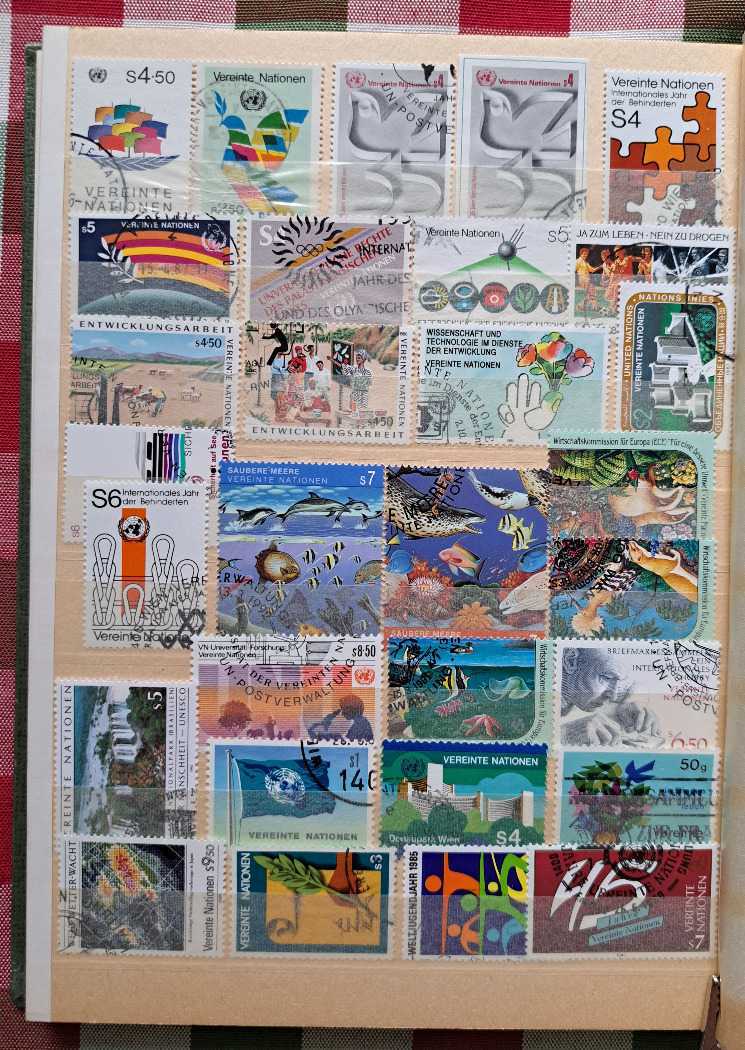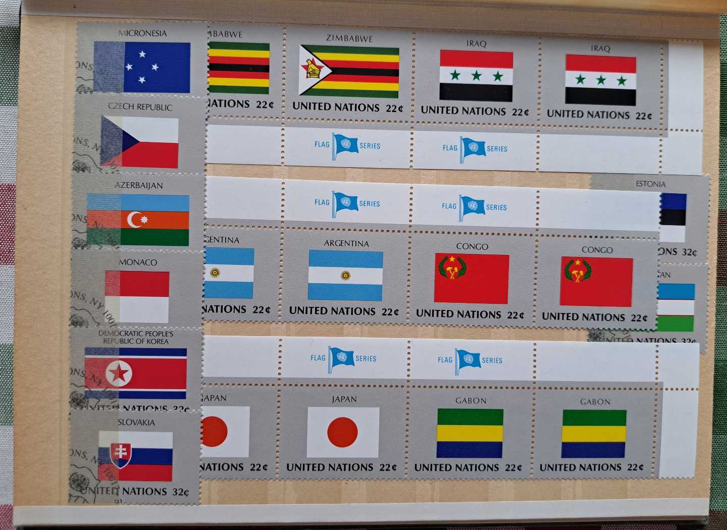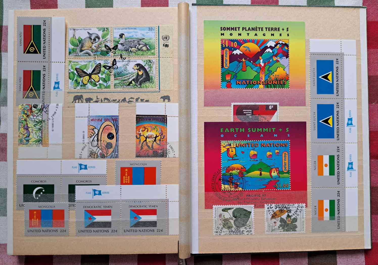 Az ENSZ bélyegek, négyesek, blokkok amerikai, osztrák és svájci kiadásúak és jó Michel katalógus értékkel bírnak.