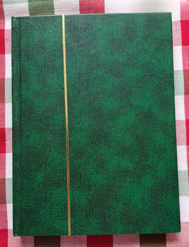 Márványos mohazöld színű, kemény műbőr borítású, arany színű csíkkal díszített, A/5-ös méretű, 8 vajszínű lapos (16 oldalas), vajszínű elő – és utóoldalas, korábbi kiadású Briefmarken gyűjtő – tároló album.