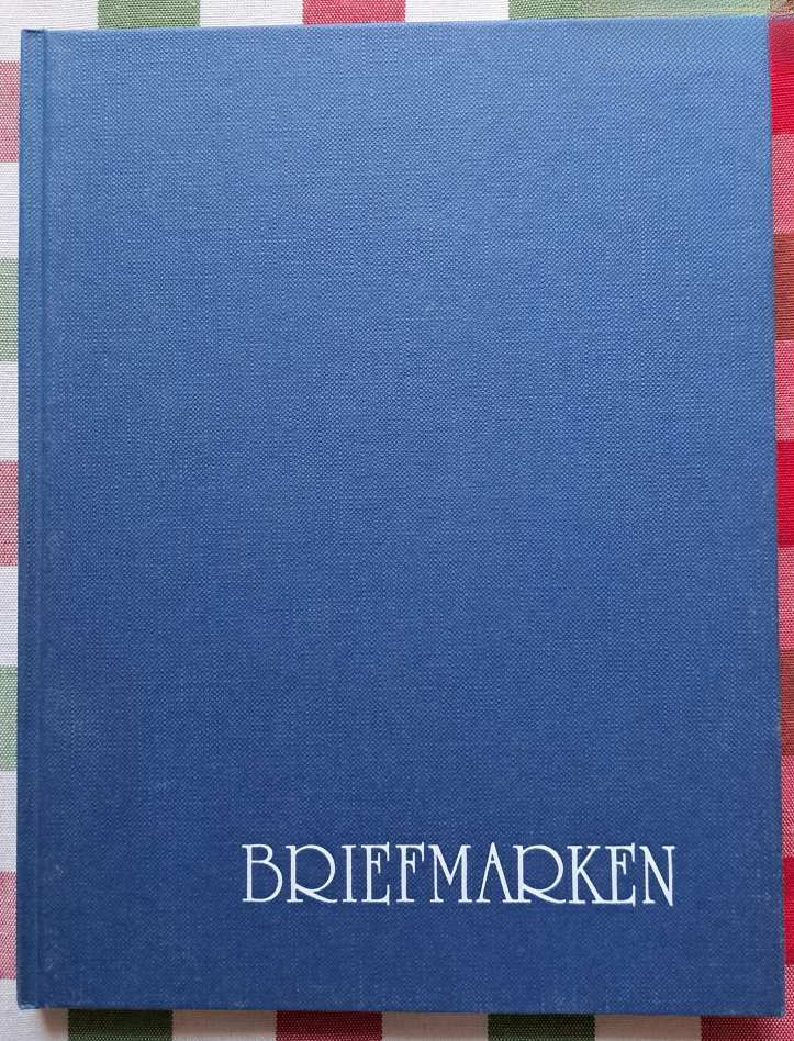Tengerkék színű, kemény, textil hatású karton borítású, fehér színű felirattal díszített, A/5-ös méretű 4 fehér lapos (8 oldalas), hófehér elő – és utó oldalas ÚJ Briefmarken gyűjtő – tároló bélyegalbum.