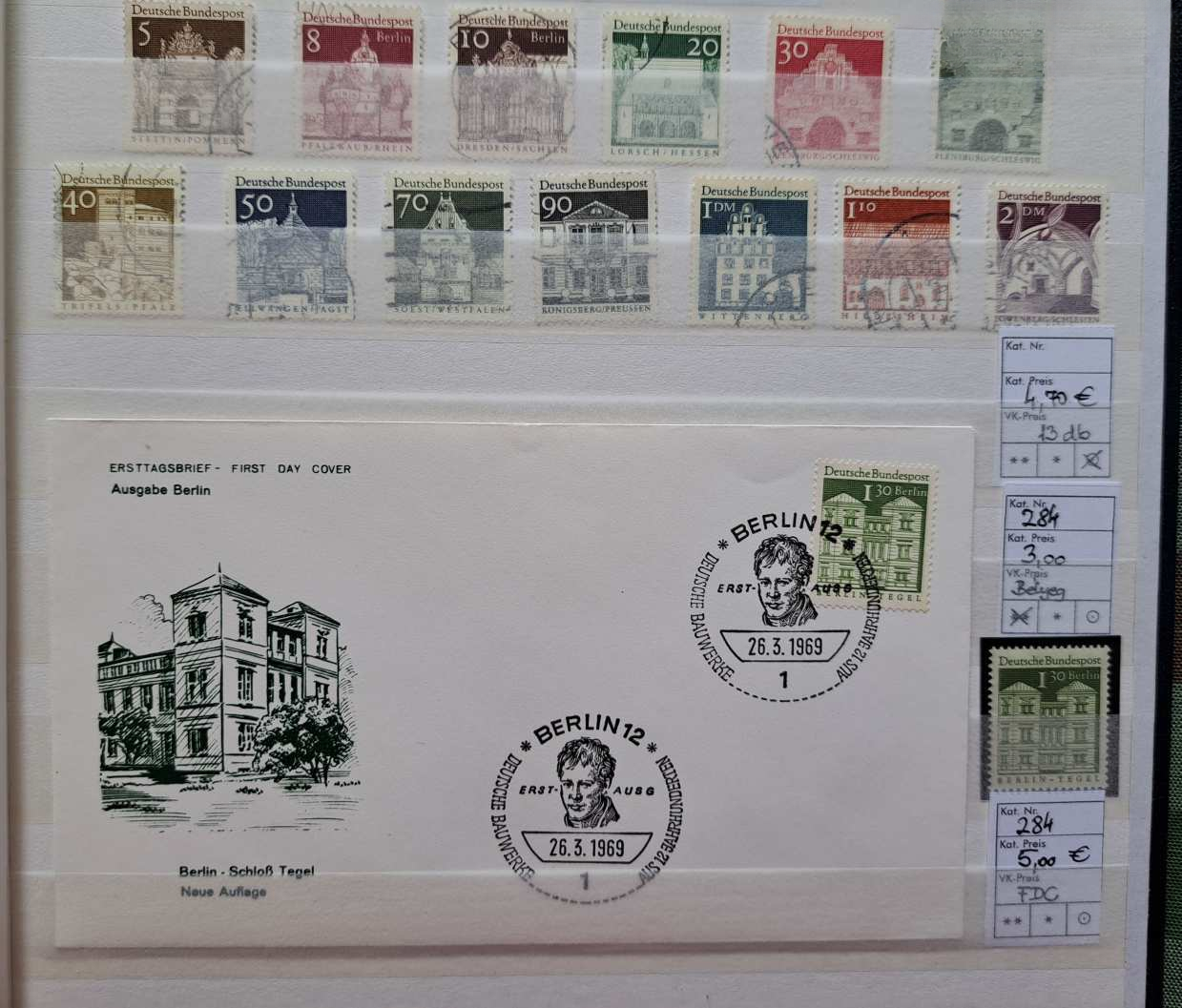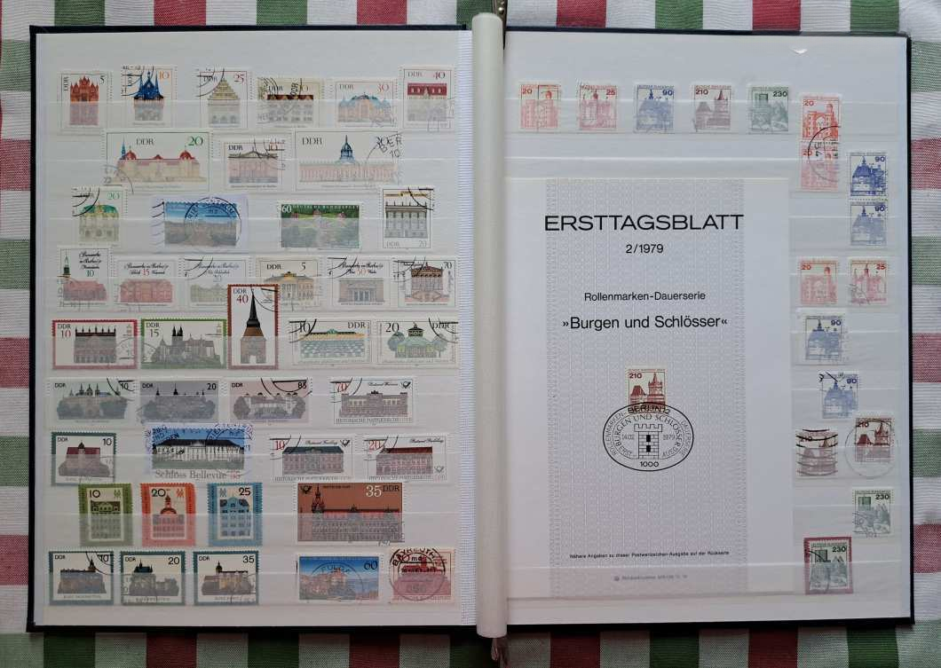A licit tárgya: 4 törtfehér lapos / 8 oldalas, ÚJ A/4-es méretű Briefmarken bélyegalbum tele „Várak és kastélyok Európában” (Burgen und Schlösser im Europa) bélyegekkel