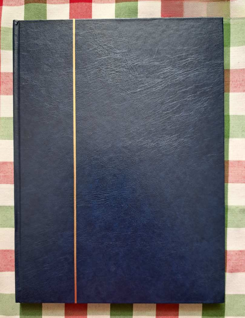 Sötétkék színű, kemény műbőr borítású, arany színű csíkkal díszített, A/4-es méretű 4 fehér lapos, (8 oldalas), hó fehér elő- és utó oldalas, ÚJ Briefmarken gyűjtő-tároló bélyegalbum.