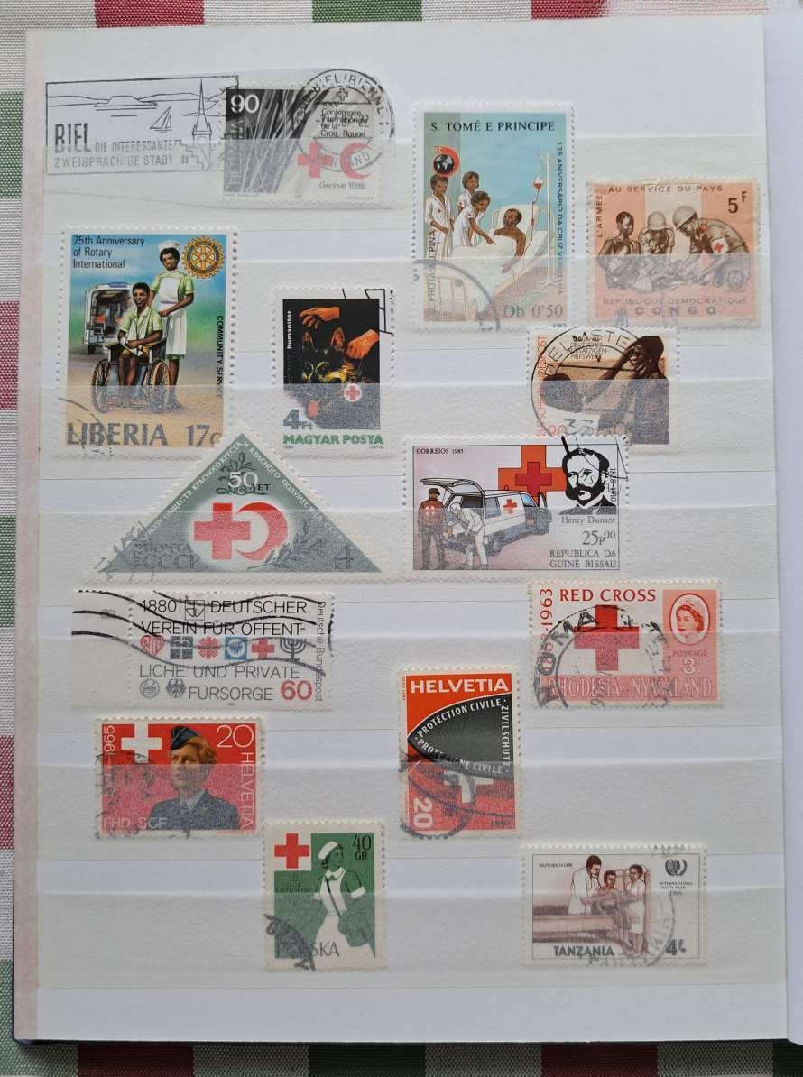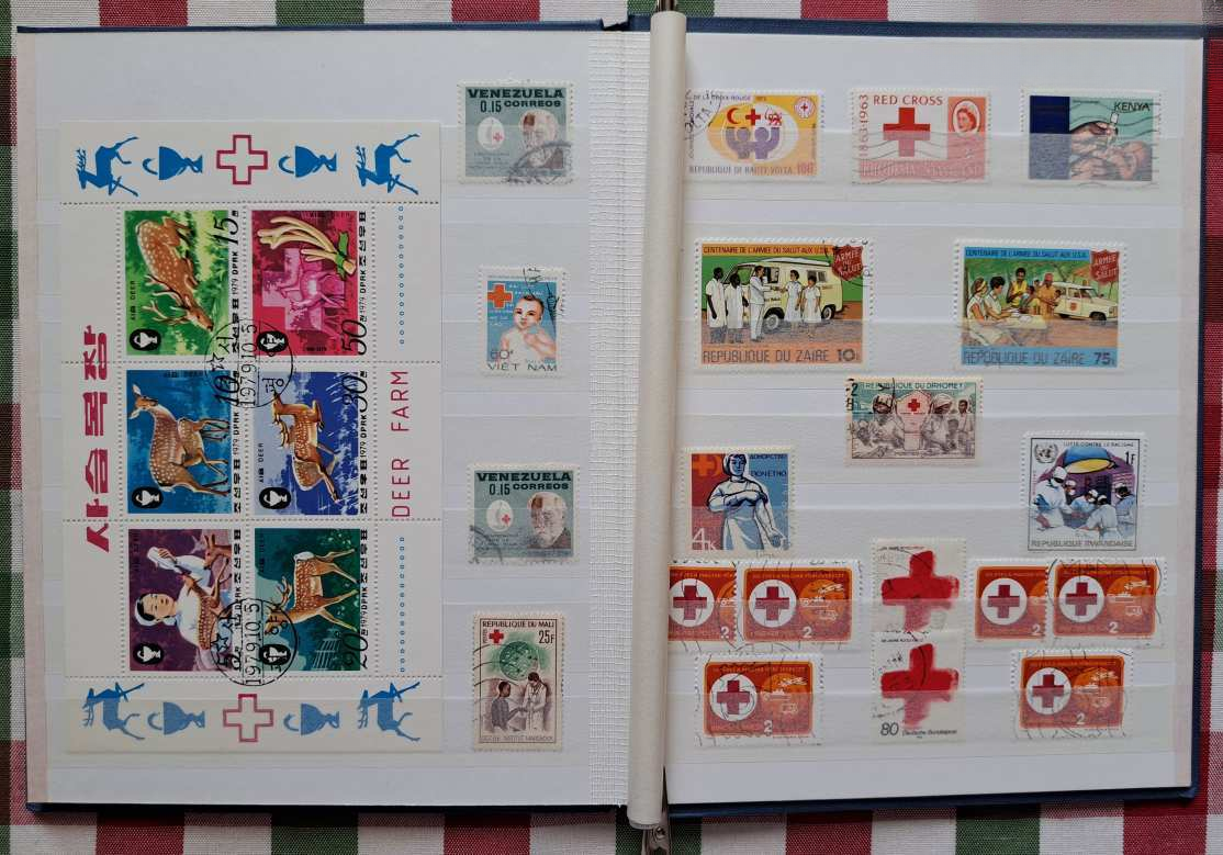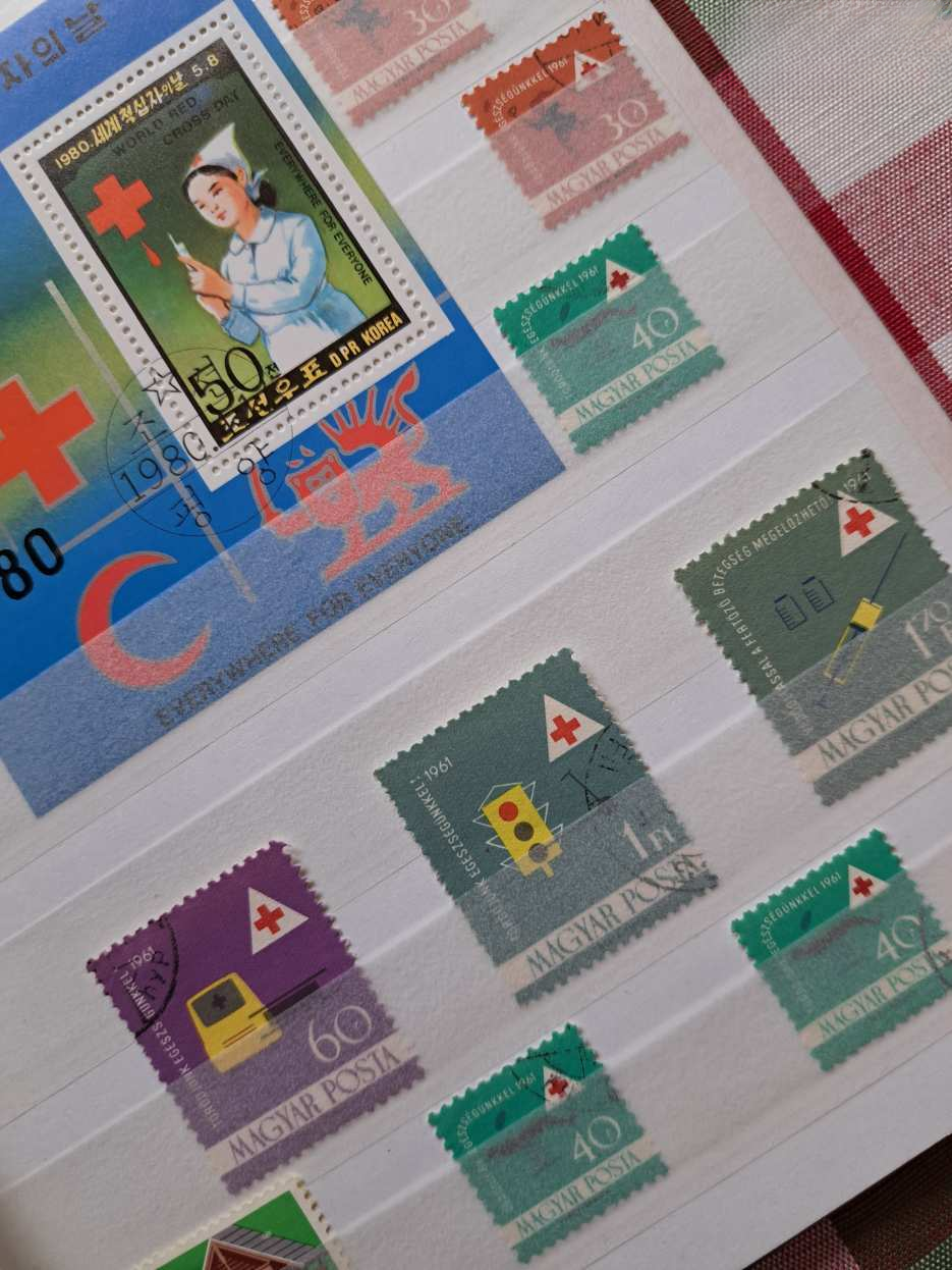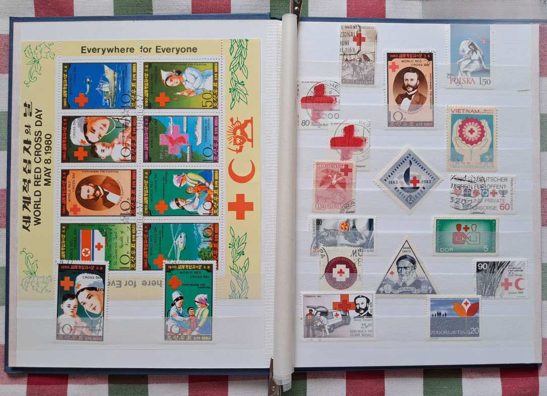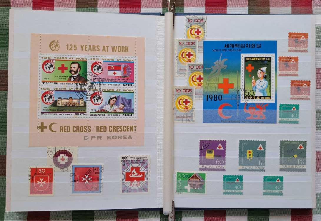 A licit tárgya: 4 fehér lapos / 8 oldalas, A/5-ös méretű ÚJ Herlitz bélyegalbumban „Vöröskereszt” témájú bélyegek, blokkok — az 5 földrészről