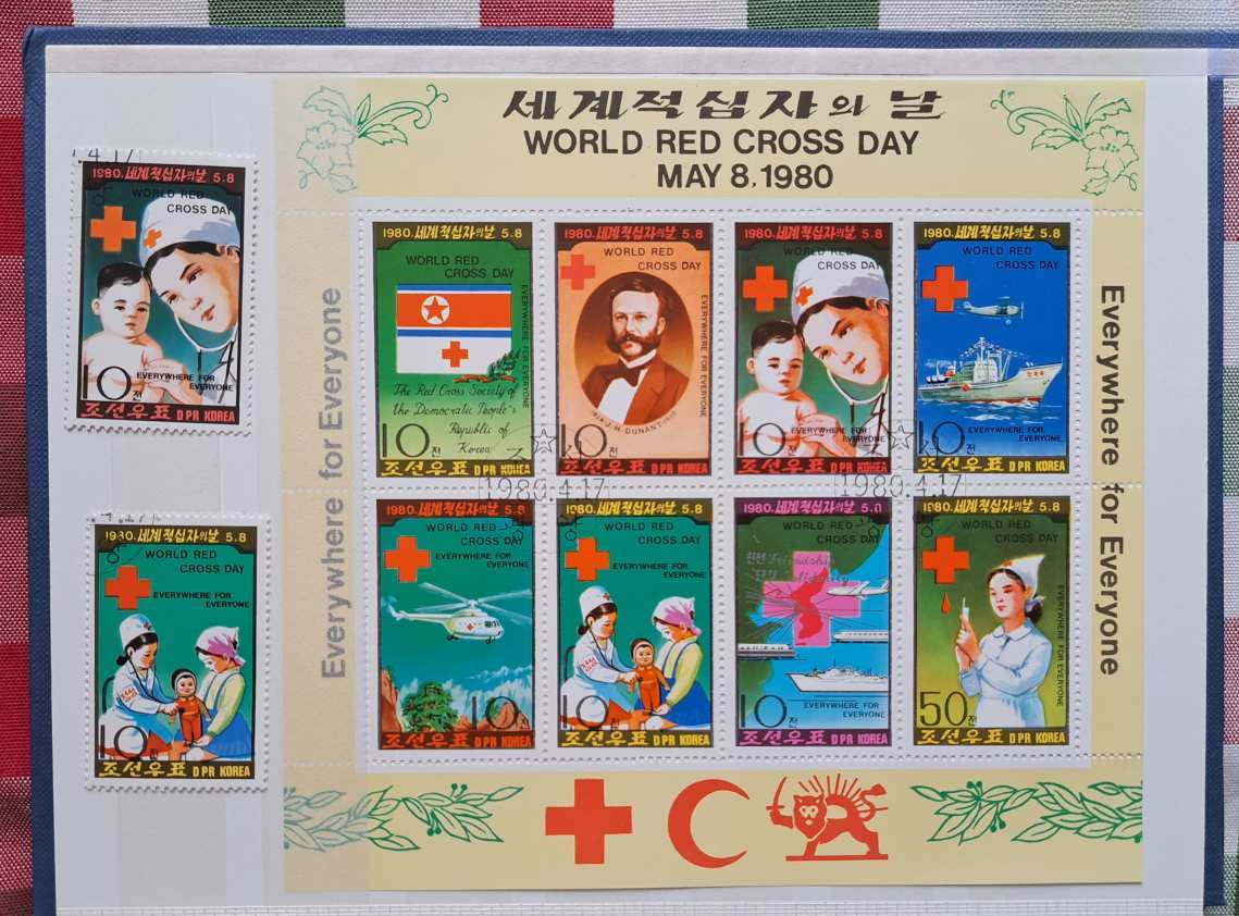 „Vöröskereszt” témájú bélyegek, blokkok az 5 földrészről, 4 lapos (8 oldal) A/5-ös ÚJ albumban + egy ajándék üveg pezsgő